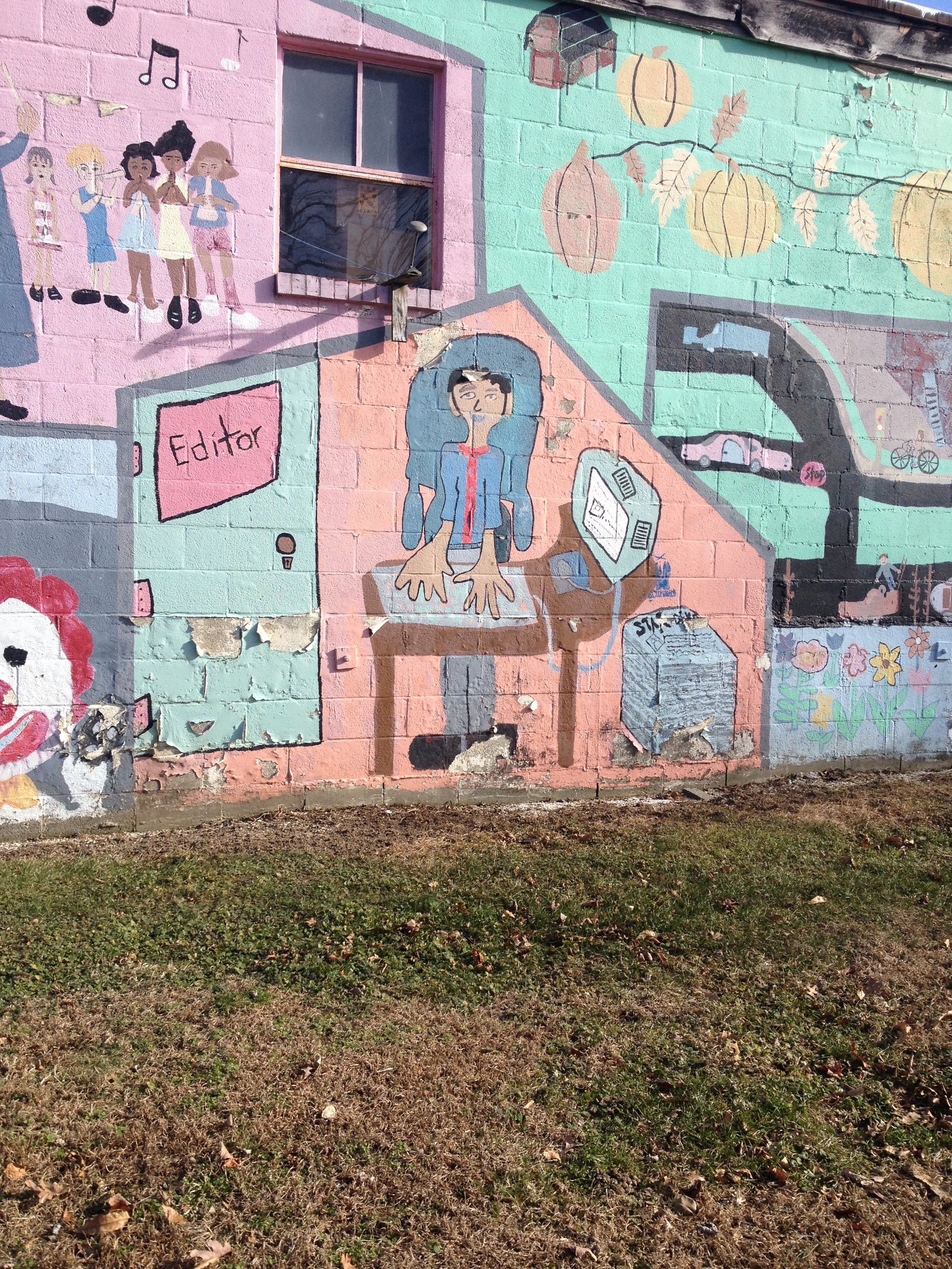 It’s a flat trail. I first went toward the park that’s at the north end of the trail, and went past woodsy areas and saw many exits/entrances to different streets and neighborhoods. The other side of the trail seemed more empty, although I did see some murals on buildings. As a newspaper reporter, I particularly was happy to find that a newspaper editor was part of a mural about various parts of the community — health, public safety, and the like.