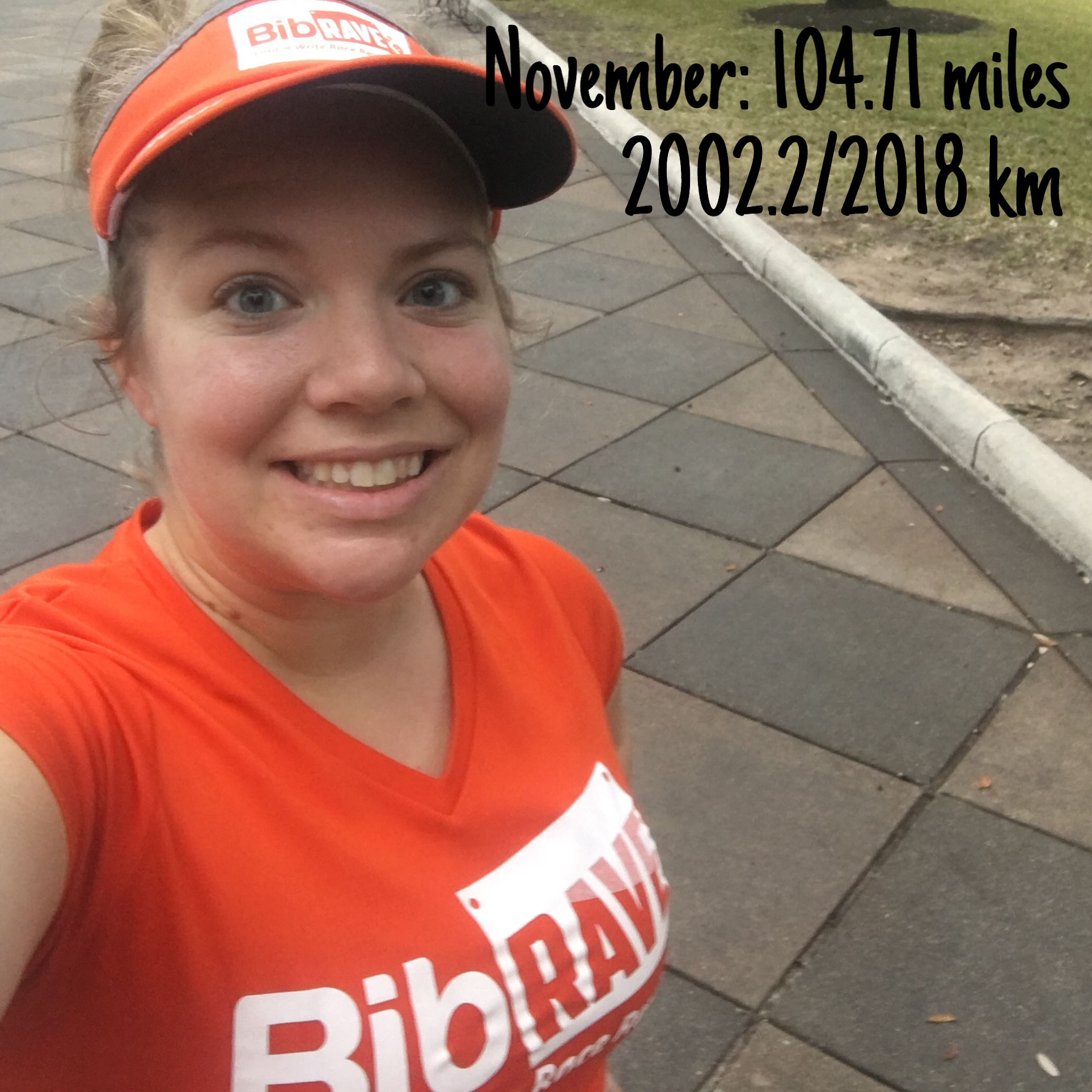 - I participated in fellow running blogger/BibRave Pro Angie’s #100miles challenge. In October, I ran 94.25 miles, so I thought Angie’s challenge sounded like a fun one, and something that would help keep me accountable. She created an Excel sheet and runners could log miles on the shared document. I made sure not to save too much running for the end, although I did pass the 100-mile mark on the last day of the month. And, I even got a headband from her and won a BUFF! Check out her blog here.