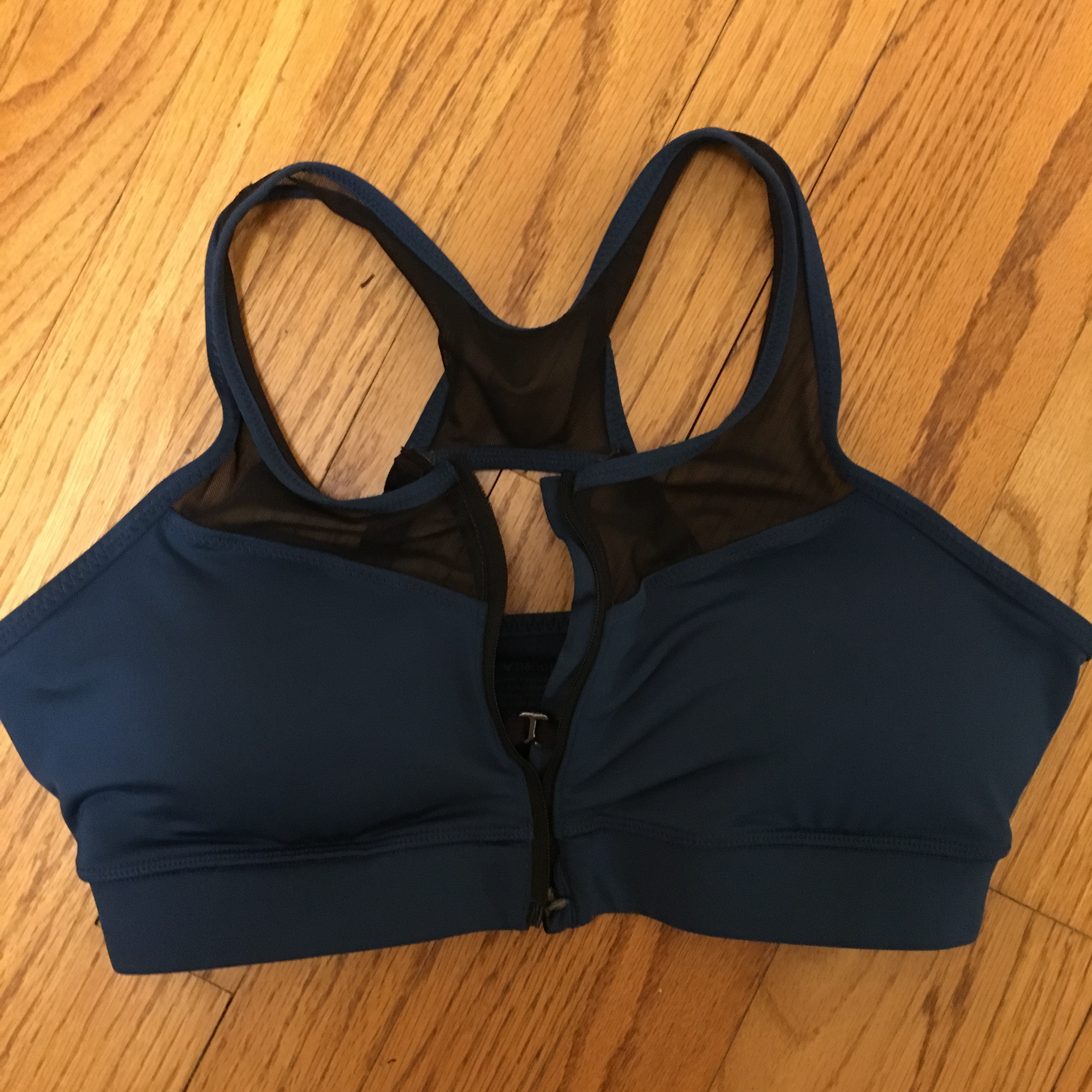 This bra has a front zipper, which is a nice perk after finishing a run. You can just zip it off rather than having to squeeze out of it. There is also a clasp on the inside of the zipper.