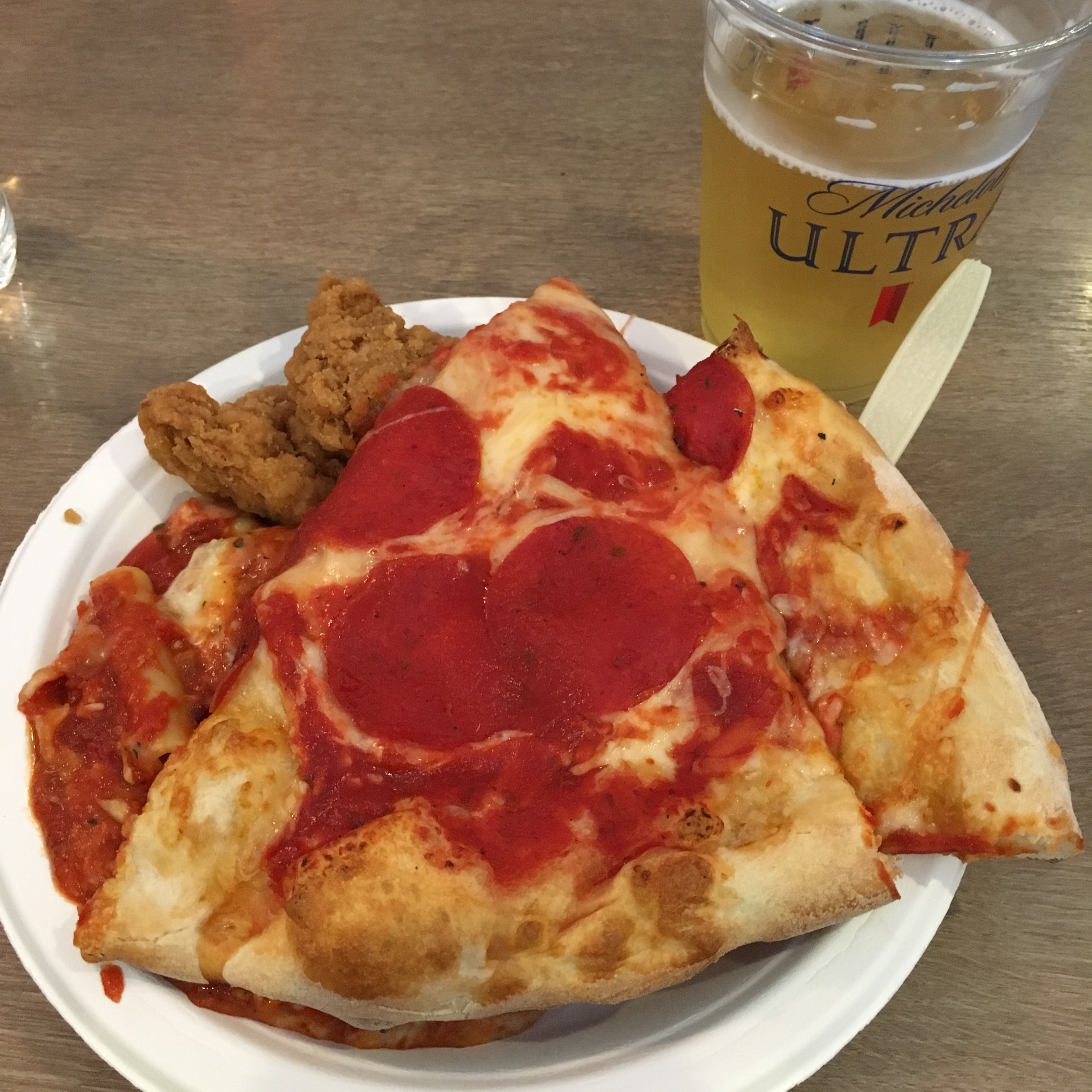 After I handed off the pacing sign to the next pacer to come in (which I’d run with the whole time — people often ask), Veronica and I headed into Grotto Pizza and had some food. There was a plentiful buffet, and I got a couple slices of pizza, some baked ziti and some chicken tenders, along with a beer.