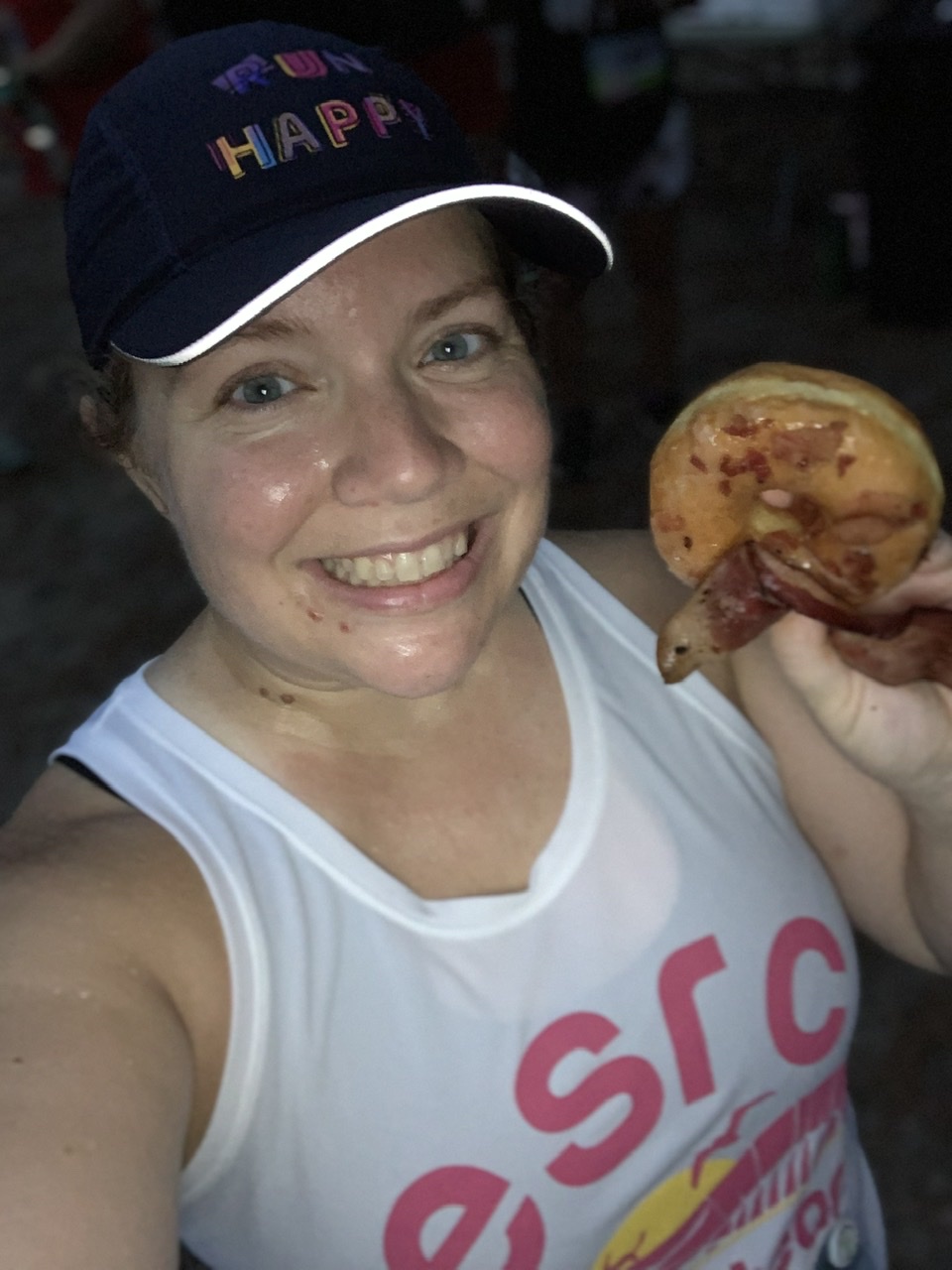 It got dark quickly, so there wasn’t a ton of time for socializing afterward, and most people had already finished (I finished 116th of 127). However, I was able to get a doughnut with bacon on it, a couple pieces of bacon and a nonalcoholic beer from Athletic Brewing Co. I then went to my car a couple times to get Eastern Shore Running Club orders for people. The second time I was at my car, it looked like a storm was imminent, so I just stayed at my car and then headed home as a deluge of rain came down.