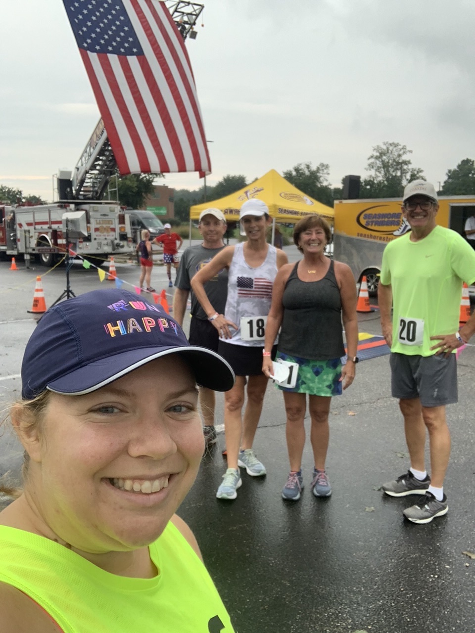 The race was held the evening of Thursday, Sept. 9. It was much easier to park than the last year I did the in-person race (the race was smaller than usual, and there was an election going on at the school the same evening in 2019), and I got my bib and shirt. I saw my Eastern Shore Running Club friends and we got a photo with the American flag before the race start.