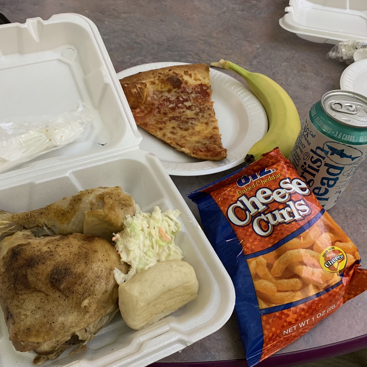 My first stop after finishing was the Vanderwende Farm Creamery ice cream truck, where I got a delicious free serving of cookies ‘n’ cream ice cream. After finishing that, I continued inside to enjoy dinner with my friends — chicken, cole slaw, a roll, pizza, a can of Dogfish Head beer, and a banana and cheese curls that I brought home. I appreciated that they had volunteers serving the food and food boxed up, and people wore masks inside aside from when eating. There was also live music.