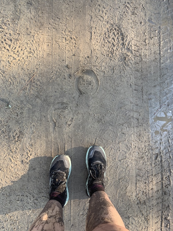 I was all smiles after making it through the mud pit, but not long after, my shoe went down into some mud and I fell trying to get it out. Thankfully, neither of my two falls were serious at all — but my hands (and leg) were extremely muddy.