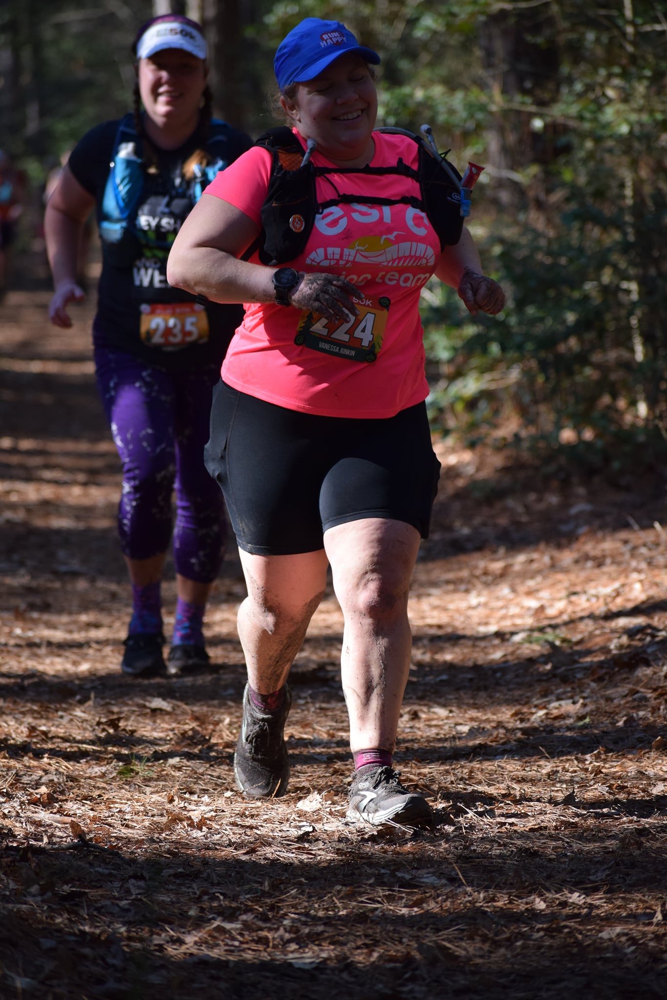 Even the next part of the trail wasn’t too tough to run on — it had fewer roots to maneuver. We continued our run-walk and probably around Mile 6 or 7, another runner, Abbi, from California, joined us. Mile 8 included the infamous mud pit where I’d been captured falling in a photo the year before. I carefully made my way through the mud, trying not to fall, but the mud actually took the shoe from another runner nearby. Someone else had come back to look for the phone she’d lost.