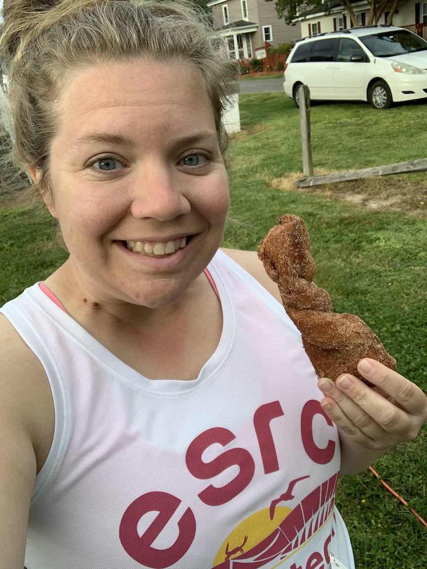 When I got to the carnival grounds where race festivities were held, I saw the Corner Bakery doughnuts. These are my favorite doughnuts, so even though I usually wouldn’t eat a doughnut before a race, I have done this before at this race and I was fine, so I did have one (a good choice, because most of them, including the kind I got, was gone afterward).
