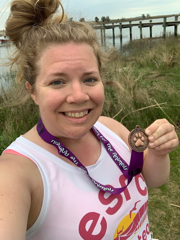 After finishing the race, I hung out at the post-race party and enjoyed a full plate of food — a hot dog, chips, and pasta salad — along with ice cream from Island Creamery. The age group awards were metal awards featuring two cats. I love cats, and even though I knew I had not been super fast, I figured I’d wait around to see if I earned one of them. I didn’t, and that’s OK. I finished fourth of five people in the female 30-34 age group and 34th of 62 finishers in the 10K, according to the results.