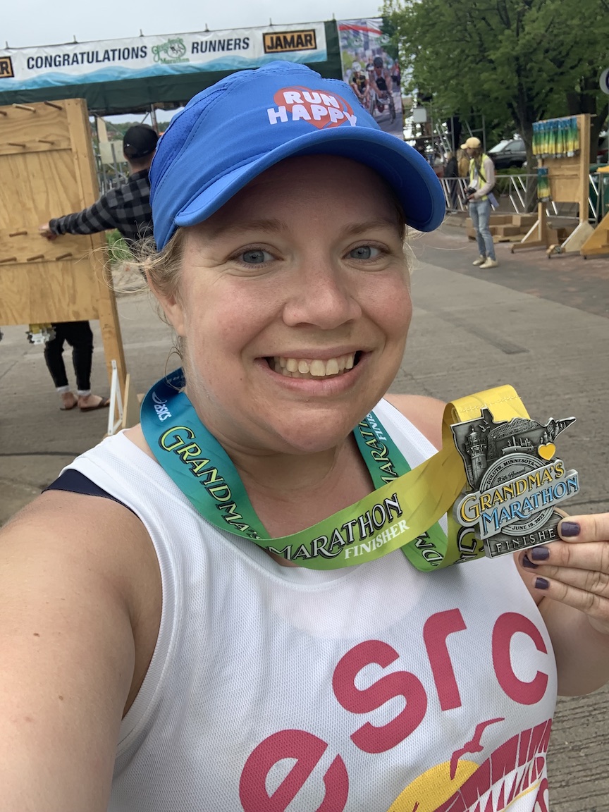 Selfie of Vanessa Junkin holding Grandma's Marathon finisher medal.