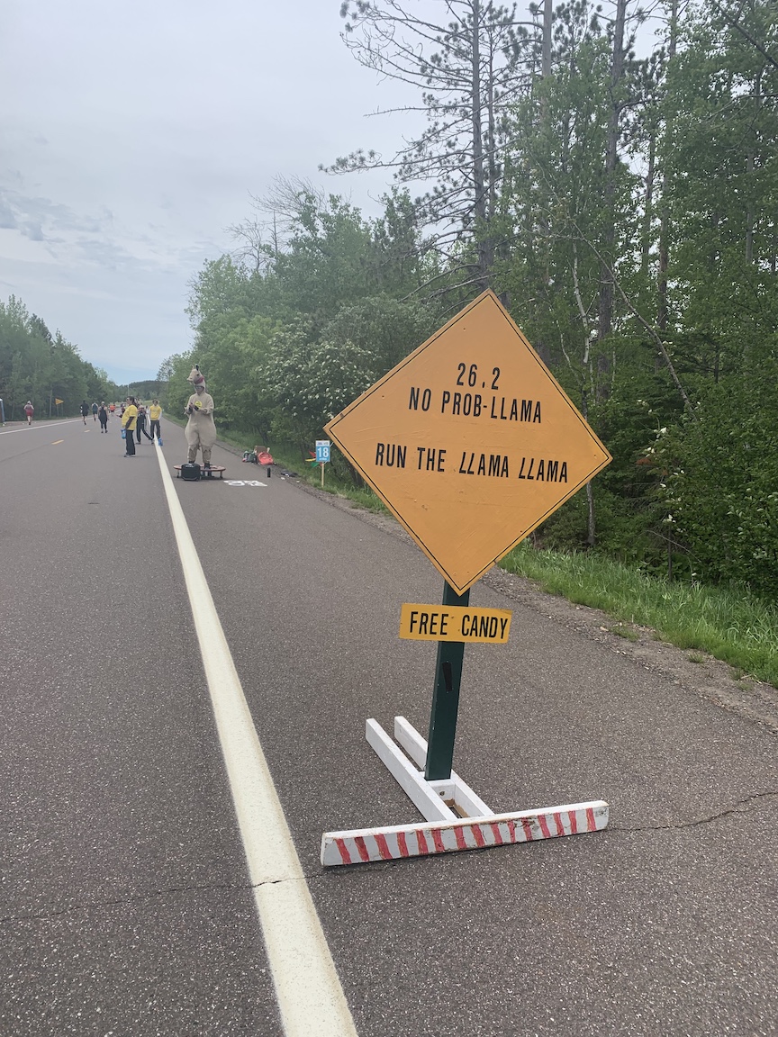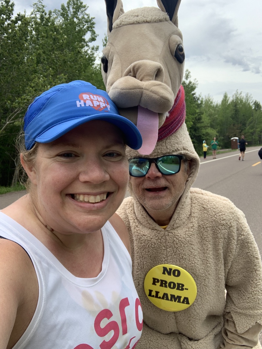 Once we started getting into Duluth and out of the more rural area — around Mile 19 or so — there were many more spectators. I took several photos along the course — I’d taken a couple early on, but then I realized I was really slowing down and it wouldn’t hurt to take some more — so I took a photo of a No Prob-Llama sign with a guy dressed up as a llama in the distance. He offered to take a selfie, so of course, I was up for that.