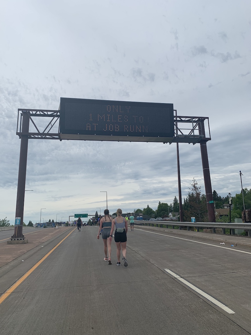 I’d also seen this sign in a photo ahead of time, so I was expecting it. How often can you run a race with a highway road sign meant just for runners? I was thinking about whether I could finish the last 4.1 miles before the six-hour mark.