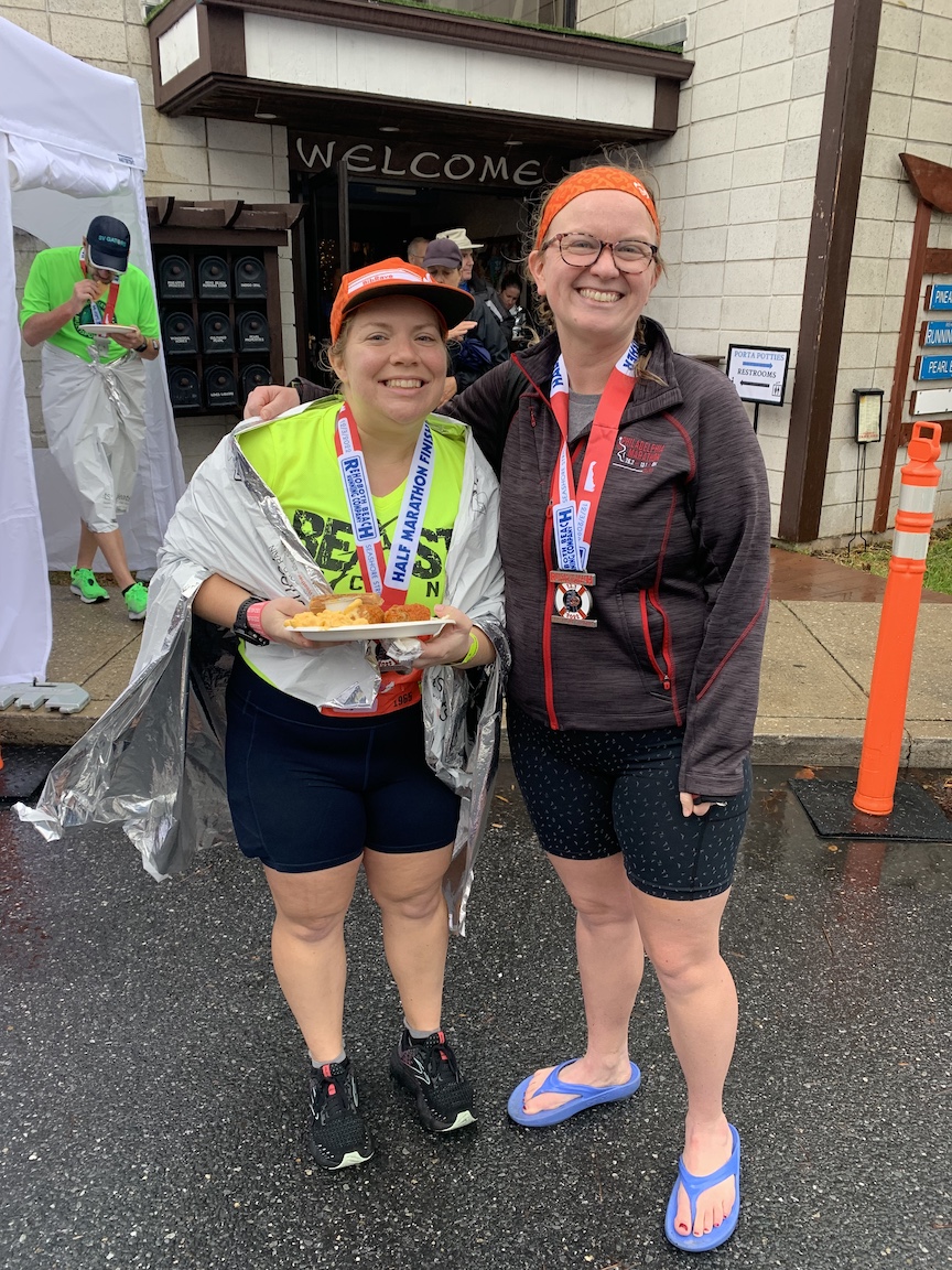 I was happy to finish the race in 2:44:21, right within my pacing guidelines. After handing off the pacer signs, I next headed to the food tent, where I got waffle sticks, mac and cheese, meatballs, cole slaw and bacon. Right outside the food tent, I got to meet fellow BibRave Pro Charline for the first time, which was fun! She ran a new personal record.