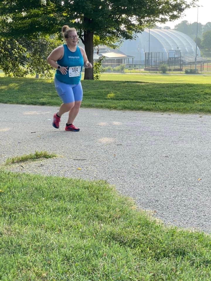 Near the end of the race, after we went through the water stop again (I did get water again, even though there wasn’t much of the race left), we had to go uphill to get to the end. Rachel encouraged me as we neared the finish. The hills were tougher for me than the heat, but I felt good as I ran.