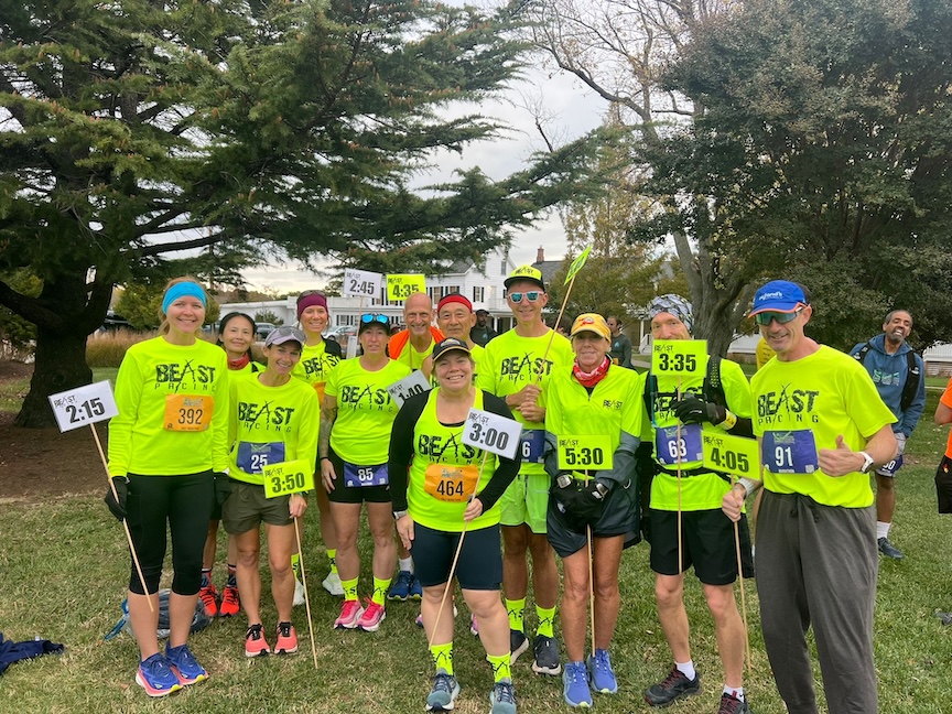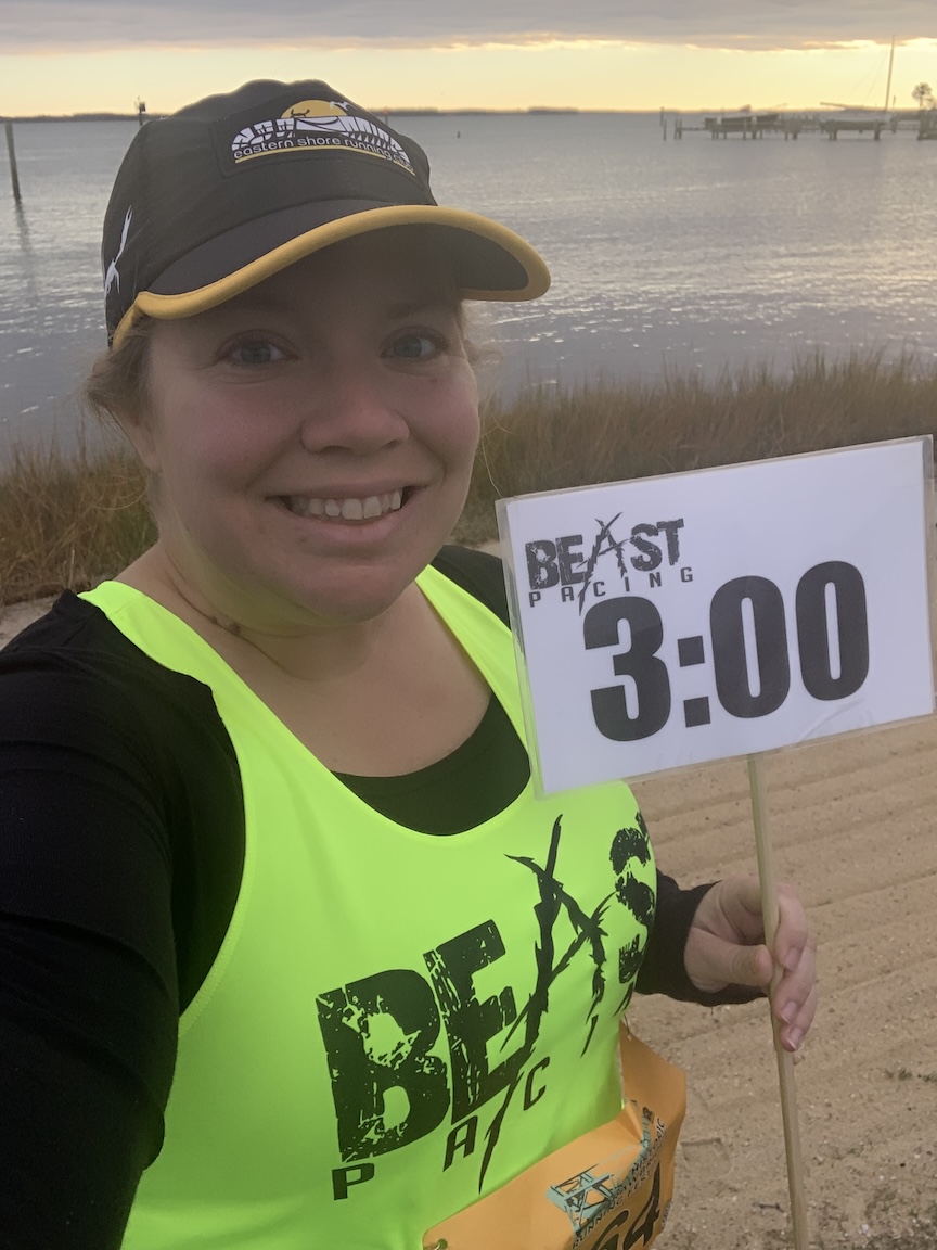 The race began at 8 a.m., but I had to be there an hour early for pacing and also needed to board a bus to the start, so I had an early wake-up and drive from my house a little over an hour away, in Salisbury. I got my race swag — a hoodie, which has all the participants’ names on the back — and bib before boarding the bus with the other participants to head to Tilghman Island from the finish in St. Michaels. I met up with some Eastern Shore Running Club friends before the start, as well as other Beast pacers. I spent some time before and after talking to Sara, who was pacing the 2:45 group and who I’ve been on pace teams with before.
