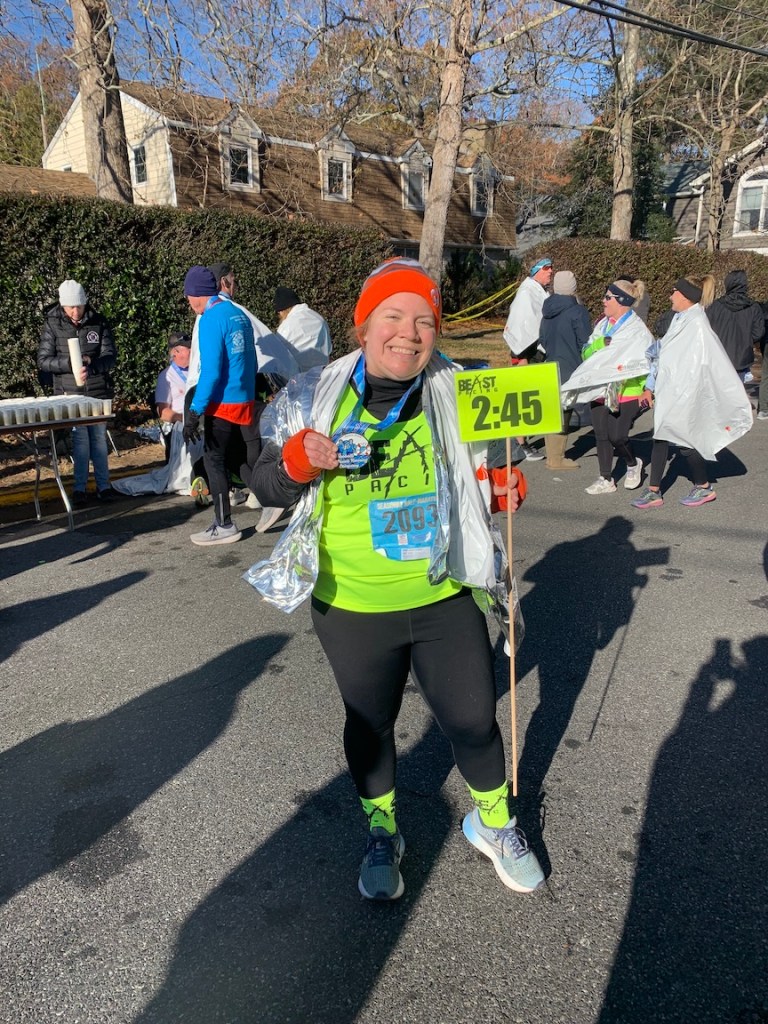 My most common pacing time recently has been 2:45 for the half marathon, and that’s what I ran for this event, on Dec. 7. As a pacer, I needed to get to the race an hour early (6 a.m. for the 7 a.m. start), and I made the early drive from my home in Salisbury. It takes about an hour in the early morning during the off-season. I also served in the role of team lead for the pacers, putting together the signs, bringing them to the team, and making sure we all arrived.