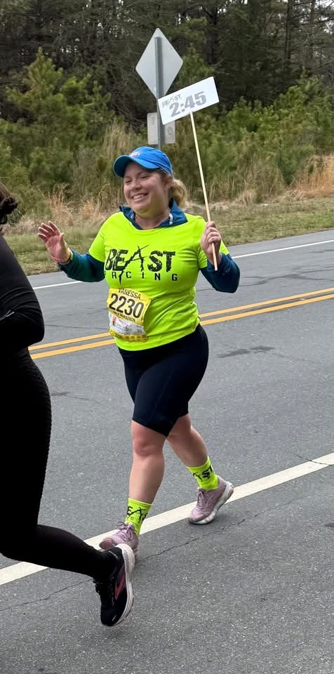 I paced with Beast Pacing. As a pacer, you have a goal time, try to run a consistent pace, and hold up a sign throughout the race so that others can run with you and try to meet their goals and use you as a guide.